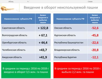 В целом по Российской Федерации картина такова, что за 2016-2018 годы (по данным региональных органов управления АПК) было введено в оборот 3,5 млн. га пашни. В свою очередь выбытие пашни за тот же период составило 2,2 млн. га.