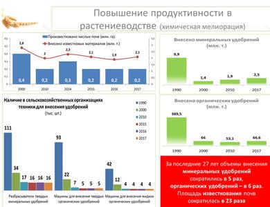Также хорошо видна ситуация с внесением удобрений. В 5 раз сократилось внесение минеральных удобрений, в 6 раз сократилось внесение органики. Площадь известкования почв сократилась в 23 раза!