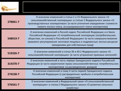 При этом наряду с предложениями по совершенствованию Федерального закона «О сельскохозяйственной кооперации» рассматриваются изменения в Лесной кодекс, Гражданский кодекс, и другие законодательные акты Российской Федерации.
