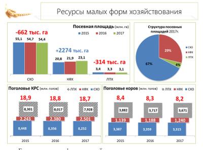 Говоря о малых формах хозяйствования мы подразумеваем ресурс кооперативного движения - фермеров, ЛПХ, средние и малые предприятия, народные предприятия. Именно они сегодня производят порядка 50% молока, мяса КРС, львиную долю картофеля и фруктов, четверть валового производства зерна. При этом ресурсная база малых форм хозяйствования, и земельные ресурсы, и поголовье сельскохозяйственных животных, и материально-техническая составляющая, предопределяет возможности активного развития.