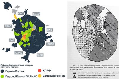 Здесь представлена карта расселения пролетариата в Москве в конце 1990 х и расположения элитных продуктовых магазинов "Азбука вкуса". Как видно все прекрасно коррелируется с итогами выборов и районами, где проиграла "Единая Россия". Деклассированное, маргинализованное население бывших рабочих районов - это клиентелла "Единой России", за КПРФ и либералов голосует политически активное население, средний класс.