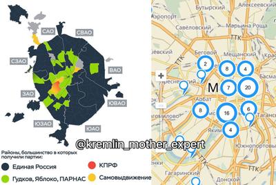 Например, в Останкино победили все кандидаты блока «Наше Останкино», где из 12 победивших депутатов – 7 депутаты, выдвинутые КПРФ. Есть районы, где «Яблоко» завоевало все мандаты муниципальных депутатов (Гагаринский), а также, где «Яблоко» или коалиция Гудкова-Каца получили все мандаты, кроме одного (например, район Ломоносовский).
