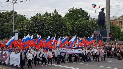 Шествие открыли маленькие дети, рожденные в Республике. Ведь пять лет – срок небольшой по историческим меркам. Но в плане того, сколько перемен за это время произошло в ДНР и в мире – это огромный срок. Лишь некоторые из ключевых событий в истории молодого государства начиная с 2014 года и заканчивая началом 2019 года них смогла вместить «Лента времени», которую пронесли участники праздника. У очень многих участников в руках были флаги России и знамена Победы. А самым популярным слоганом на растяжке был следующий «Мы выбираем Россию!».