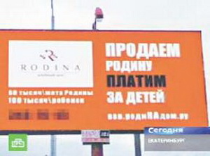 Валентина Гофинберг, сотрудник рекламного агентства: «На плакатах было написано: «Продаем Родину, платим за детей». И рядом дается расшифровка, что метр квадратный в жилом комплексе «Родина» стоит 60 тысяч рублей, и за каждого ребенка дается бонус, премия, то есть вычитается из цены за квартиру 100 тысяч».