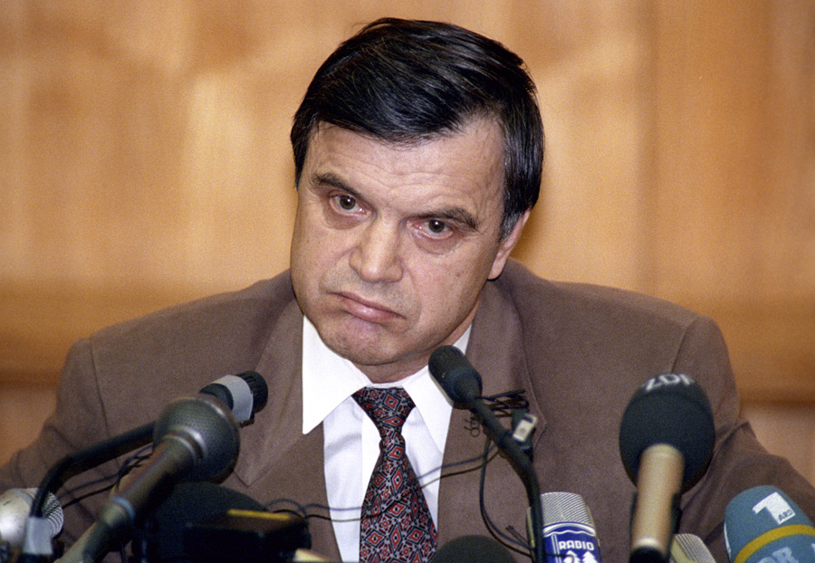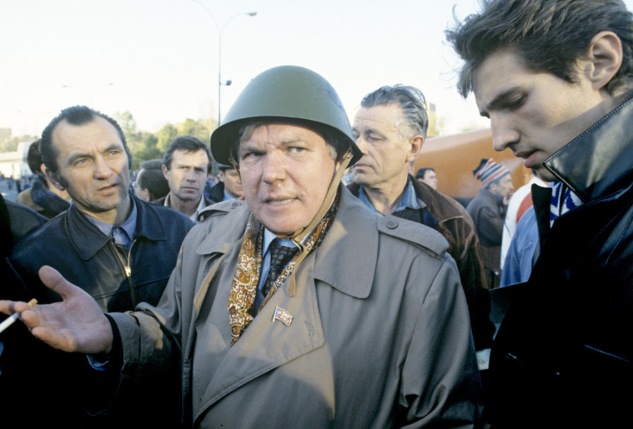 Лидер общественно-политического движения «Трудовая Россия» Виктор Анпилов выступает с обращением к участникам митинга с балкона Дома Советов РФ. © Владимир Федоренко/РИА Новости