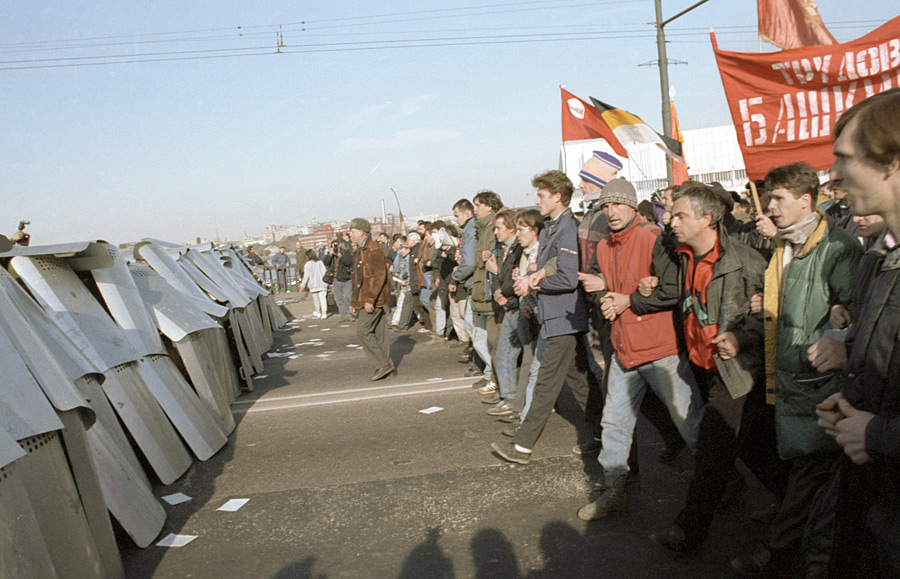 Участники митинга на Октябрьской площади, прорвавшие оцепление ОМОНа у Крымского моста двигаются к Смоленской площади в октябре 1993 г. © Игорь Михалев/РИА Новости