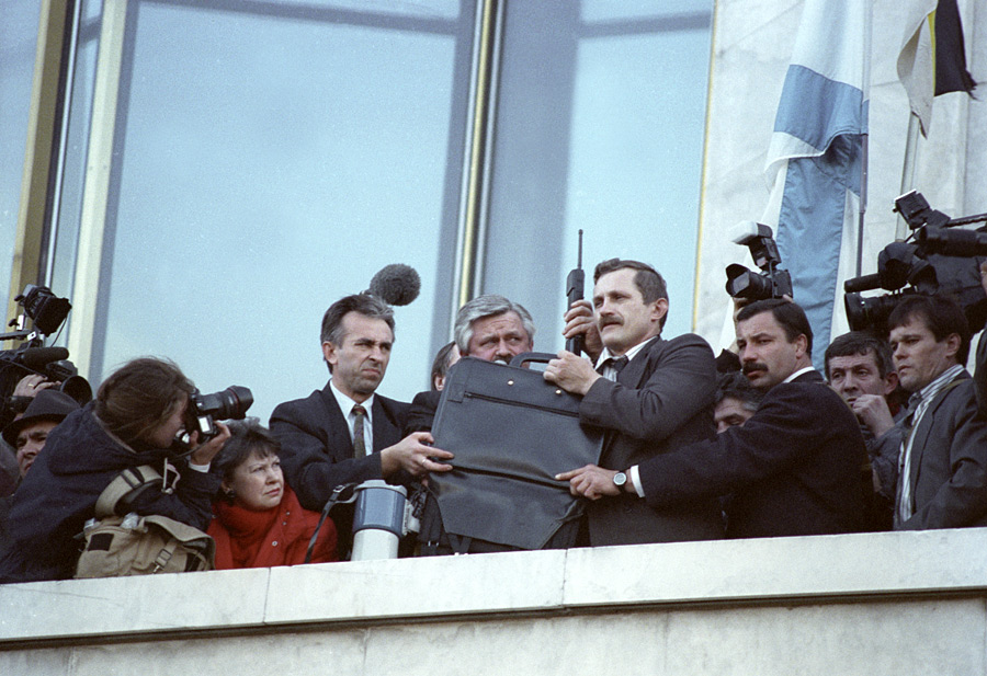 Вице-президент РФ Александр Руцкой выступает с обращением к участникам митинга с балкона Дома Советов РФ. © Александр Поляков/РИА Новости