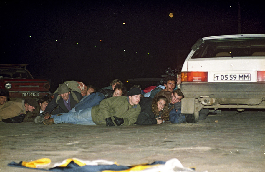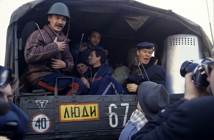 Машина с демонстрантами — сторонниками Верховного Совета РФ на пути к телецентру «Останкино». © Владимир Вяткин/РИА Новости