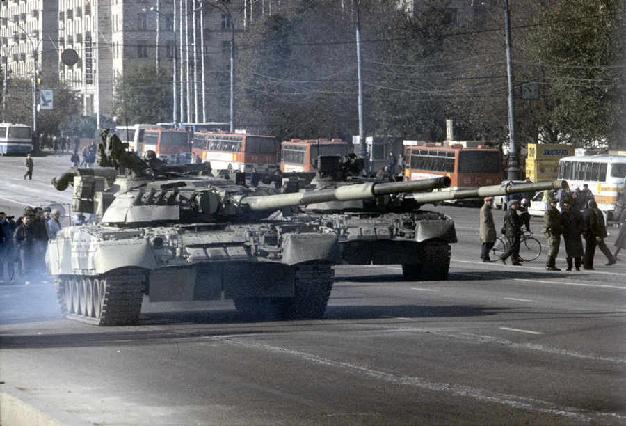 Колонна танков, готовая пересечь Новоарбатский мост. Начался штурм здания Дома Советов Российской Федерации. © Юрий Заритовский/РИА Новости