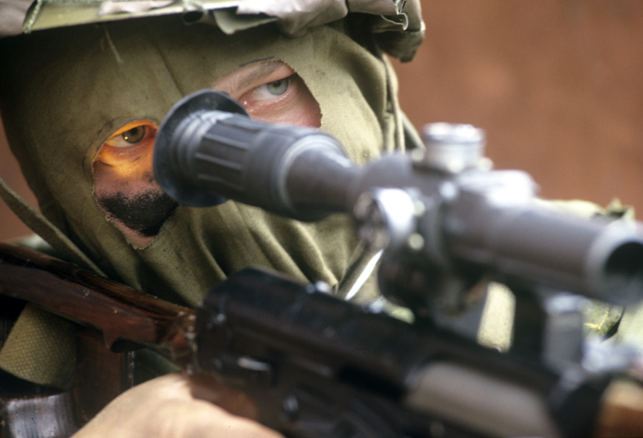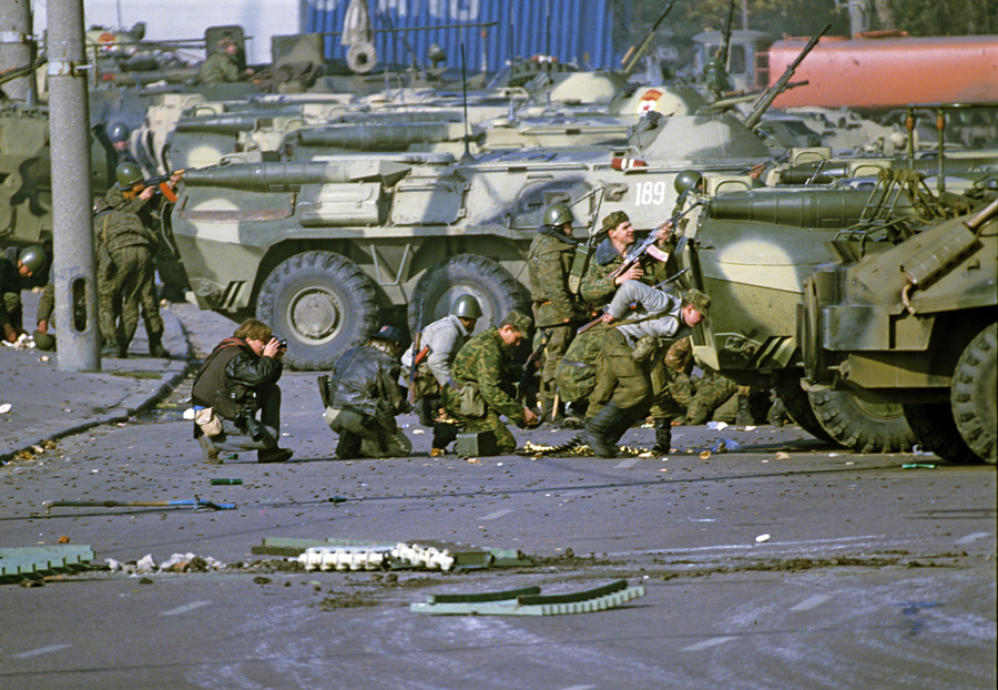 Снайпер правительственных войск, находясь на крыше одного из домов, контролирует окна здания парламента во время перестрелки вокруг здания Дома Советов Российской Федерации. © Владимир Вяткин/РИА Новости