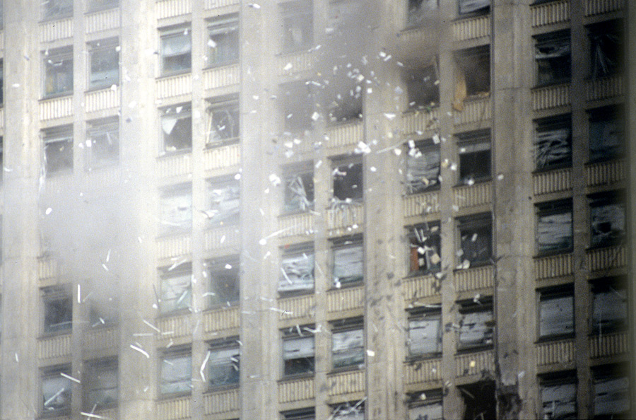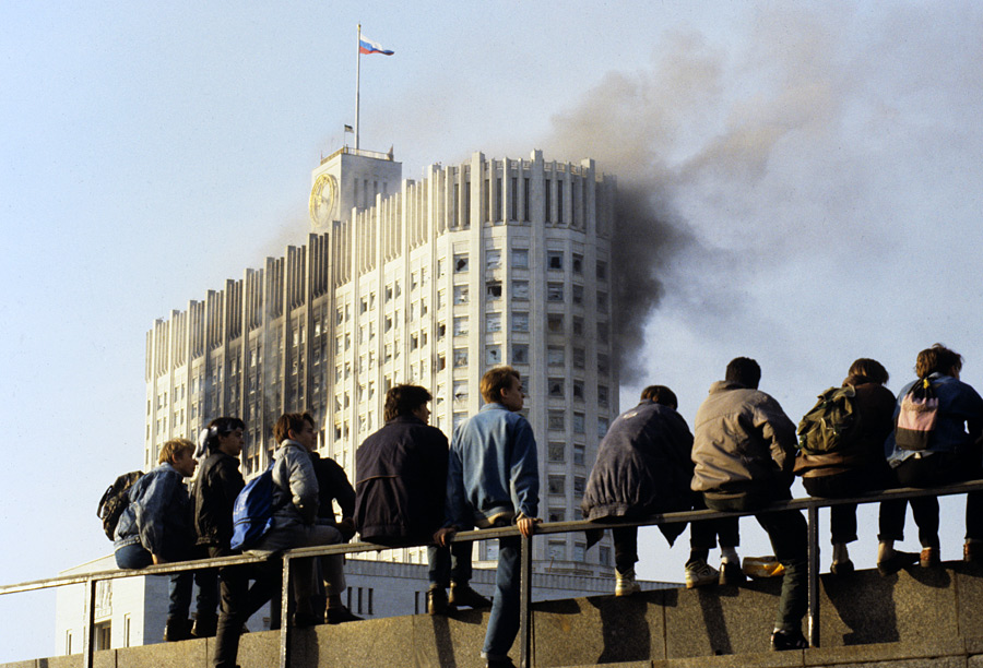 Дым из разбитых окон горящего здания Дома Советов Российской Федерации, обстрелянного во время штурма из танков и бронетранспортеров. Вид со стороны Краснопресненской набережной. © Владимир Федоренко/РИА Новости