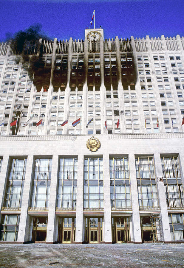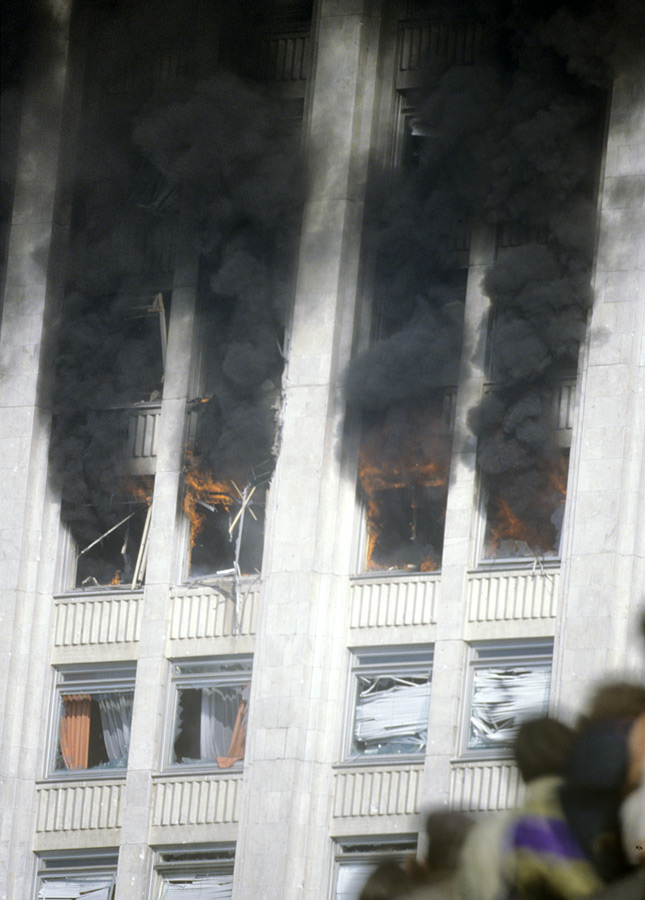 Дым из окон горящего здания Дома Советов Российской Федерации, обстрелянного во время штурма из танков и бронетранспортеров. © Александр Поляков/РИА Новости