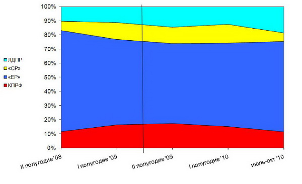 Доля КПРФ в эфире возросла после принятия закона №95 (во втором полугодии 2009 г.), однако вскоре снова проявилась тенденция к её спаду. Так, если во втором полугодии 2009 г. Компартия получила в 3 раза меньше эфирного времени, чем «ЕР», то в период с июля по октябрь 2010 – в 6 раз.
