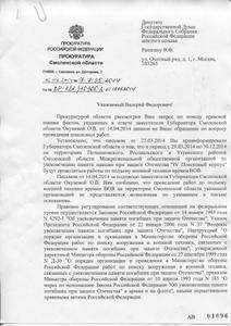 Прокуратурой области рассмотрен Ваш запрос по поводу правовой оценки фактов, указанных в ответе заместителя Губернатора Смоленской области Окуневой О.В. от 14.04.2014 данном на Ваше обращение по вопросу проведения поисковых работ.