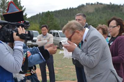 Забайкальскую делегацию встречали первый заместитель главы МО "Хоринский район" Владимир Ильков и преседатель Совета депутатов Хоринского района Анатолий Орлов. Гостям вручили «хадаки» (ритуальный шарф) и провели традиционный обряд поклонения с просьбами о здоровье, счастье и благополучии.