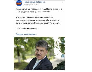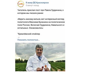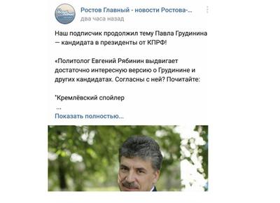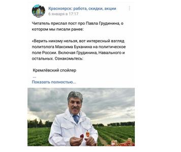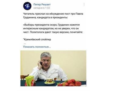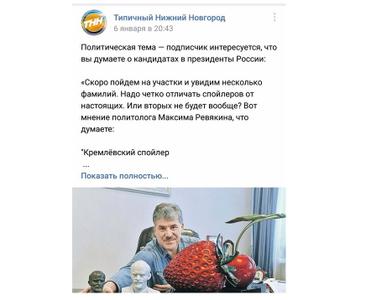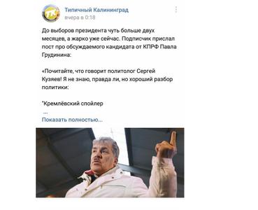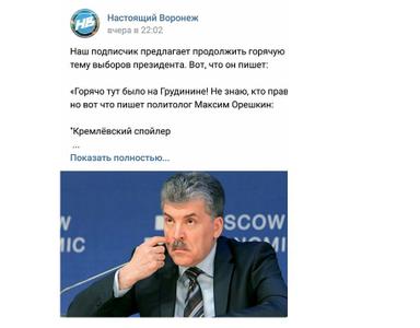 Но и про другие интересные моменты. В социальных сетях в сообществах от Сибири до Калининграда молодым людям объясняют, что "Грудинин - спойлер, на выборы не ходите". Тема качается очень активно и очень топорно: по одной методичке. К одному тексту пришиваются имена разных "политологов", в том числе некоего "Максима Орешкина", хе-хе. Подписчик не поленился наделать скринов.