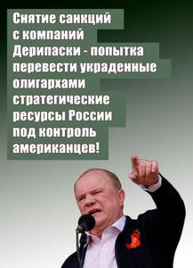 Лидер КПРФ Г.А. Зюганов в своем Телеграм-канале высказался о передаче активов российского олигарха Дерипаски, в том числе предприятий алюминиевой промышленности, под контроль США.