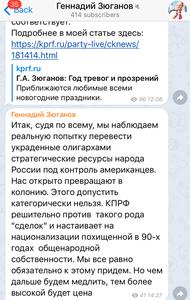 «Итак, судя по всему, мы наблюдаем реальную попытку перевести украденные олигархами стратегические ресурсы народа России под контроль американцев. Нас открыто превращают в колонию. Этого допустить категорически нельзя. КПРФ решительно противтакого рода «сделок» и настаивает на национализации похищенной в 90-х годахобщенародной собственности. Мы все равно обязательно к этому придем. Но чем дальше будем медлить, тем более высокой будет цена».