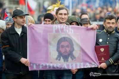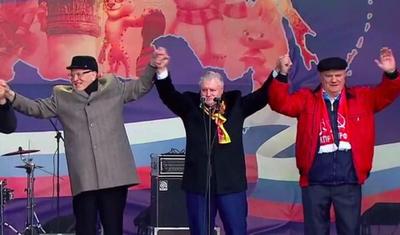 Кроме того, на сцену вышел певец Иосиф Кобзон. "Мы едины, поэтому мы сильны и поэтому нас боятся и будут бояться", - сказал он перед тем, как исполнить песню "Я люблю тебя, Россия".