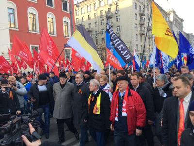 Шествие "Мы едины" в Москве завершилось митингом в Театральном проезде, где выступили лидеры политических партий, артисты и герои труда. На митинге выступил лидер КПРФ Г.А.Зюганов.
