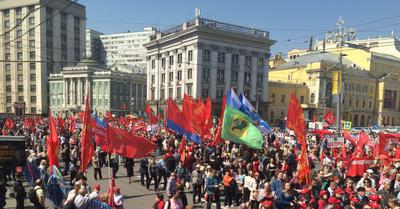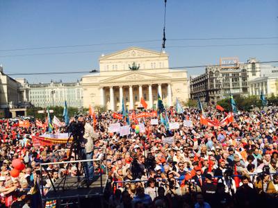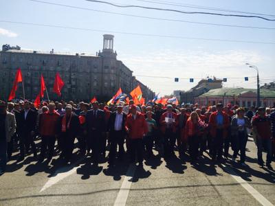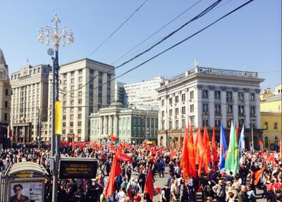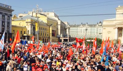 Первомайское шествие КПРФ, стартовавшее с Октябрьской площади Москвы завершилось митингом на Театральной площади. Более 10 тысяч человек прошли у Кремля, Манежной к Театральной площади.