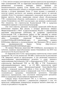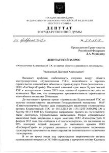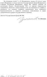 На основании статей 7 и 14 Федерального закона «О статусе члена Совета Федерации и статусе депутата Государственной Думы Федерального Собрания Российской Федерации», прошу Вас принять решение об исключении объекта «Кудепстинская ТЭС» из перечня строительства олимпийских объектов в городе-курорте Сочи, как выпавшего из графика и ненужного, что позволит сохранить значительную часть курортного бальнеологического и морского потенциала единственного в стране субтропического курорта государственного значения.