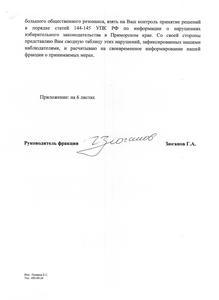 Представителями КПРФ поданы соответствующие заявления в подразделения Следственного Комитета РФ в Приморском крае для решения вопроса о возбуждении уголовных дел. К сожалению, каких-либо конкретных действий со стороны следственных органов пока не последовало, тогда как требуются незамедлительные меры по фиксации следов правонарушений и изъятию соответствующей документации. Хочется надеяться, что Ваши подчинённые в Приморском крае не допустят утраты доказательств и освобождение виновных от ответственности. Просил бы Вас, с учётом большого общественного резонанса, взять на Ваш контроль принятие решений в порядке статей 144-145 УПК РФ по информации о нарушениях избирательного законодательства в Приморском крае. Со своей стороны представляю Вам сводную таблицу этих нарушений, зафиксированных нашими наблюдателями, и рассчитываю на своевременное информирование нашей фракции о принимаемых мерах.