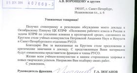В адрес депутата-коммуниста Законодательного Собрания Санкт-Петербурга А.В. Воронцова поступило письмо от Председателя ЦК КПРФ Г.А. Зюганова, в котором лидер партии благодарит ученых-коммунистов РУСО и ПАНИ за работу в период подготовки к октябрьскому Пленуму ЦК КПРФ.