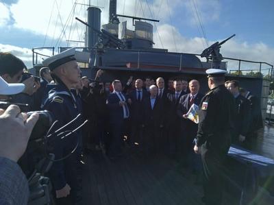 Делегация ЦК КПРФ во главе с Г.А. Зюгановым побывала на борту легендарного крейсера боевой славы Аврора. Экскурсию провел командир корабля, капитан 2 ранга Ю.В. Шишкарев.