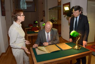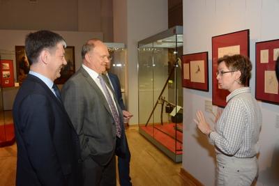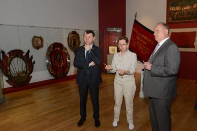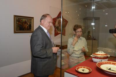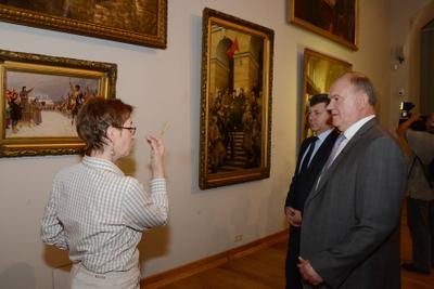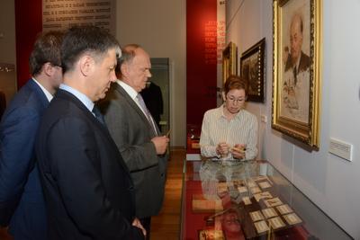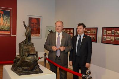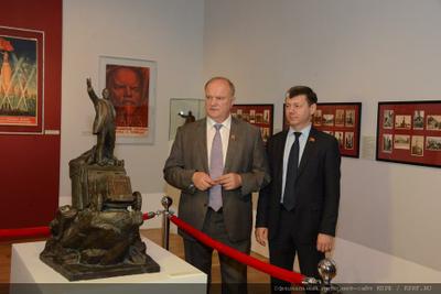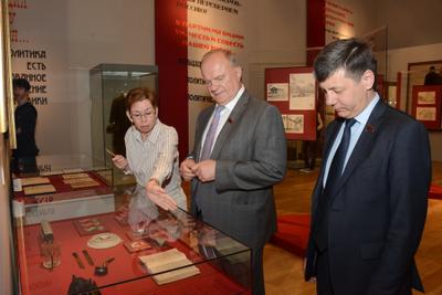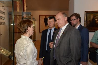 Г.А. Зюганов в сопровождении заместителя Председателя ЦК КПРФ Д.Г. Новикова осмотрел экспозицию и дал ей высокую оценку.