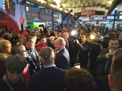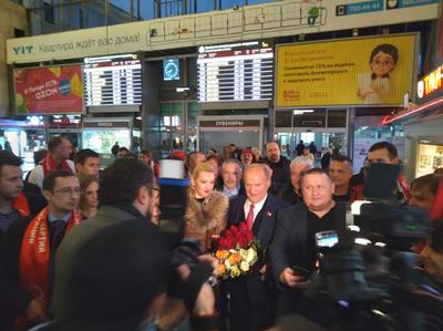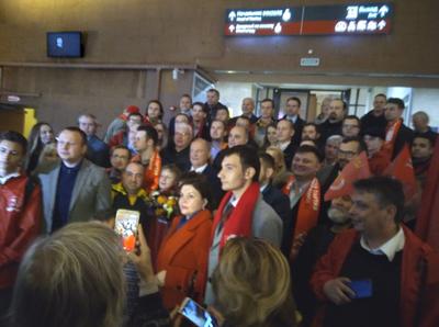 На вокзале собралась многочисленная делегация местных коммунистов. В чимле встречающих были: первый секретарь Санкт-Петербургского горкома КПРФ Р.И Кононенко, первый секретарь Ленинградского обкома КПРФ В.А. Царихин, руководитель фракции КПРФ в городском Парламенте Санкт-Петербурга О.А. Ходунова, депутат фракции КПРФ в Госдуме С.М. Пантелеев, член ЦК КПРФ Ю.П. Белов, а также представители СМИ.