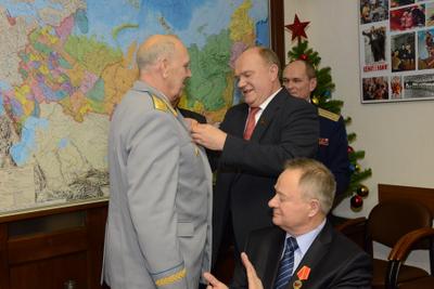 В завершение Г.А. Зюганов поздравил собравшихся с наступающим Новым Годом. Затем он вручил ряду участников «круглого стола» памятные медали ЦК КПРФ «90 лет СССР».