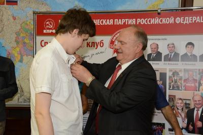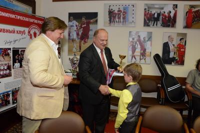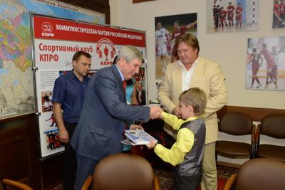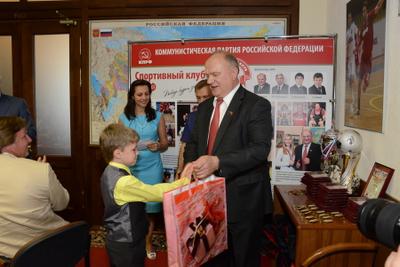 Школьник Валерий Ангелополо от имени спортклуба КПРФ вручил Геннадию Андреевичу Зюганову памятные подарки.