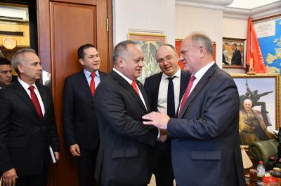 В четверг, 17 октября, состоялась встреча Председателя ЦК КПРФ Г.А. Зюганова с делегацией Боливарианской Республики Венесуэла во главе с Первым Заместителем Председателя Единой социалистической партии Венесуэлы (PSUV), Председателем Национального учредительного собрания Боливарианской Республики Венесуэла Диосдадо Кабельо Рондон и Чрезвычайным и Полномочным Послом Боливарианской Республики Венесуэла в Российской Федерации Карлос Рафаэль Фариа Тортоса.