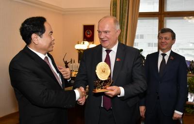 Геннадий Андреевич отметил, что между руководством КПРФ и КПВ существуют самые тесные связи. И очередным их подтверждением стала встреча Г.А. Зюганова с Генеральным секретарем Компартии Вьетнама товарищем Нгуен Фу Чонгом, которая состоялась в Москве 8 сентября. Руководство КПРФ также максимально способствует сохранению дружественных отношений между нашими странами.