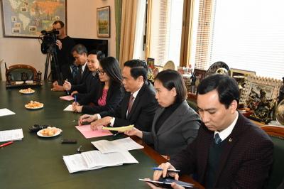 В ходе беседы Г.А. Зюганов пригласил вьетнамскую делегацию принять участие в праздничных мероприятиях, посвященных 100-летию Ленинского Комсомола. Геннадий Андреевич также вручил товарищу Чан Тхань Ману памятную медаль ЦК КПРФ, посвященную этому знаменательному событию.