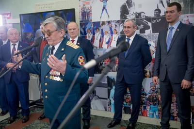 Г.А. Зюганов напомнил, что выставка открывается накануне столетия РККА, где «все блестяще владели всеми видами оружия».