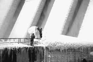 Этой зимой впервые за всю свою историю на станции заработал водосброс. До сих пор он эксплуатировался только несколько месяцев в году – в период паводка. В остальное время вода проходила через 10 гидроагрегатов. Но такая перемена привела к появлению ледяных наростов.