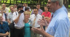 Мельников свою аудиторию явно знал и любил. Он в течение минут 10 изложил основные пункты своей программы по проблемам пенсий, точечной застройки, транспорта, социальных гарантий, тарифов ЖКХ, заявил, что нынешним городским властям москвичи безразличны, и горячо поддержал негодование жителей района бесконтрольным строительством бизнес-центров.