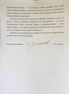 Геннадий Зюганов поблагодарил предстоятеля РПЦ за сохранение памяти героев Великой Отечественной войны и назвал главный храм Вооруженных сил «зримым и целостным образом единства веры и державности». КПРФ поддержала строительство данного комплекса.