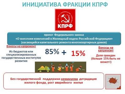 Ранее в феврале депутаты Госдумы от КПРФ Сергей Обухов и Валерий Рашкин премьер-министру России Дмитрию Медведеву ликвидировать фонды капитального ремонта и вернуть поступившие туда деньги россиянам.