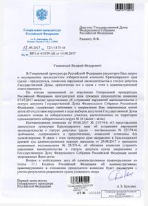 Валерий Рашкин был вынужден обратиться в прокуратуру в связи с нарушением ИККК закона. Прокурор внес представление об устранении нарушения закона. Избирком упорствовал: собрал заседание и принял решение № 25/374-6 об отказе в удовлетворении требований прокуратуры ().