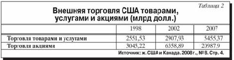 Взрывной рост спекулятивно-финансового пузыря, необеспеченных кредитов не заставили себя ждать. И на мировом рынке приоритеты США как-то исподволь изменились (см. таблицу 2). На первое место вышла торговля акциями. При увеличении торговли товарами и услугами в 2 раза торговля акциями за девять лет возросла в 7 раз. В результате произошло указанное выше увеличение удельного веса финансового сектора в ВВП страны. Финансовых воротил США это устраивает. Оно подтверждает «обоснованность» притязаний спекулятивного финансового капитала на господствующее положение в экономике, на установление в стране своих порядков. По догмам буржуазной науки самый большой «вкладчик» в ВВП является главным двигателем развития экономики.
