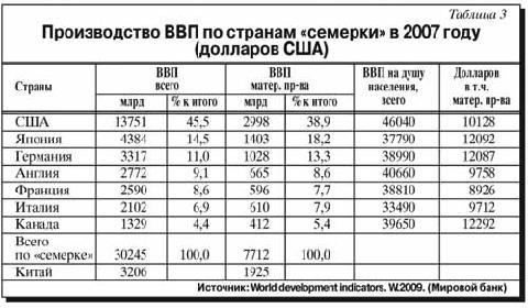 Огромные суммы фиктивных включений в ВВП США требуют обязательного учета их при оценке его реальности. За последние 30 лет прирост ВВП по статье «Финансовые услуги» происходил в основном за счет спекулятивных доходов. А если бы он увеличивался темпами роста доходов от обслуживания воспроизводственных процессов в других отраслях экономики, то в 2006 году его общая сумма составила бы чуть больше 1 триллиона, а не 2,8 триллиона долларов, как это зафиксировано американской статистикой. При сравнении с другими странами по дутому показателю ВВП США выглядит бесспорным лидером, а их экономика – намного сильнее, чем на самом деле. И это сбивает с толку многих. Даже ученые социалистической ориентации воспринимают обобщающие показатели американской статистики некритически .А их объективность сомнительна. По показателю ВВП с включениями фиктивного продукта экономика США в 2007 году превосходила экономику Японию в 3,1 раза, Германии – в 4,1 раза, Китая – в 4,3 раза и производила почти половину всей валовой продукции «семерки». При сравнении этих стран по ВВП материального производства экономика США превосходила японскую не в 3,1, а в 2 раза, китайскую не в 4,3, а в 1,5 раза, а ее доля в «семерке» не достигала и 40%. Особенно заметна разница дутых и фактических показателей при сравнении экономик по их эффективности или уровню развития, за который принимается производство ВВП на душу населения. Если по «дутому» ВВП экономика США уверенно опережает всю «семерку», по реальному ВВП значительно отстает и от Японии, и от Германии и Канады, делит только четвертое, пятое и шестое места с Англией и Италией (см. таблицу 3). Реальные показатели разрушают миф о необычайно высокой эффективности американской экономики, о ее безусловном мировом лидерстве. Сползание США на вторые позиции по эффективности экономики – результат спекулятивно-финансового вырождения капитала, сопровождающегося разрушением реального сектора экономики. Оно является подтверждением, что при постановке компаний и фирм на рулетку никакая экономика не может достигать той силы и эффективности, которые соответствуют ее материально-техническим возможностям.