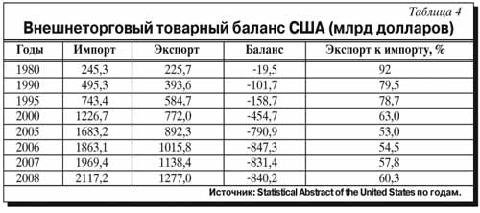 Разумеется, США умалчивают о паразитизме своего потребления и истинных его причинах. Виновниками возникновения сложных ситуаций в своей экономике они объявляют то Японию, то Китай, то западных конкурентов, добивающихся профицита своих бюджетов, «добивающихся за счет США». Кроме того, прогрессирующий дефицит внешнеторгового товарного баланса пытаются объяснить превращением страны в экспортера услуг. На самом деле такого превращения нет. С 1995 по 2007 год доля США в мировом экспорте услуг сократилась с 16,3 до 13,3%. Незначительно она возросла и в экспорте страны – с 25,3 до 28,0 процентов. Положительное сальдо по торговле услугами несколько выросло, но общее отрицательное сальдо внешнеторгового баланса не уменьшается.