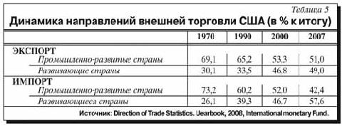 Уступая своим торговым конкурентам из высокоразвитых стран, США отыгрываются за счет стран развивающихся. Их легче опутать системой неравноправных договоров и соглашений, да и разница между ценами на сырье, сельхозпродукты и ценами на продукцию машиностроения здесь больше. Для США это выгодно. Поэтому и экспорт, и импорт страны все больше перемещаются в развивающиеся страны (см. таблицу 5).