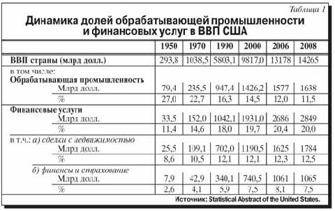 Люди со склонностью к паразитической деятельности как очень легкому способу получения доходов предприимчивы, в буржуазном обществе находят применение своим способностям во многих областях экономики. Какие-то объемы их деятельности включаются в ВВП и торговли, и здравоохранения, и образования. Но самый большой объем доходов от паразитизма включается в ВВП через финансовый сектор экономики, именуемый «финансовые услуги». В этой статье американская статистика объединяет услуги двух отраслей: одна – финансы и страхование, вторая – сделки с недвижимостью, показывая их одной строкой. В соответствии со статистическим классификатором «Финансы и страхование» являются отраслью американской экономики, доходы которой складываются из части переливающихся финансовых потоков и из стоимости услуг финансовых учреждений, банков и фондовых рынков. Любые связанные с платежами операции приносят этой отрасли доход. Но в своей основной части ВВП финансовой системы США является накруткой услуг на обращающийся фиктивный капитал. За счет быстрого увеличения спекулятивно-финансового пузыря «вклад» финансового сектора в ВВП страны за последние годы значительно превзошел вклад обрабатывающей промышленности (см. таблицу 1). Это явление постсоветского периода. Раньше, когда финансовый сектор в основном обслуживал воспроизводственные процессы в реальном секторе экономики, положение было иное. В 1950 году вклад финансистов в ВВП страны составлял 11,4%, в 1970 году – 14,6%, что равнялось 42% и 64% вклада перерабатывающей промышленности. Тут сказалось не только изменение пристрастий денежных воротил. Хищный капитал знал, что финансовые спекуляции являются более легким способом получения доходов, чем деятельность предпринимательская. Просто до последней четверти двадцатого века условия для их проведения были ограниченными. Спекуляции являются процессом, в котором используются настоящие деньги, их суррогаты, фиктивный капитал, фиктивная продукция, фиктивные собственники. Но главными являются настоящие деньги как носители реальной ценности. Их должно быть достаточно для обеспечения ликвидности разного рода фиктивных ценностей. А количество денег в обращении ограничивалось необходимостью их конвертации в золото, драгоценности, валюту других стран. Кроме того, ограничивалось использование и имеющихся денег: финансовым учреждениям запрещалось играть на бирже деньгами вкладчиков. И спекулятивно-финансовый капитал потрудился, чтобы изменить положение. Первым его завоеванием была отмена в 1971 году конвертации доллара, а также его частичная девальвация. Это дало ход печатному станку. Вторым достижением являлась отмена в 2002 году запрета на использование денег вкладчиков для игры на бирже. Третьим завоеванием стало введение в официальный денежный оборот новых финансовых инструментов, позволявших получать реальные деньги под несуществующее финансовое обеспечение и несуществующие товары.