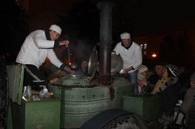 К 97-й годовщине Великого Октября Сталинградский обком КПРФ организовал полевую кухню перед площадью Павших борцов и накормил кашей всех желающих.
