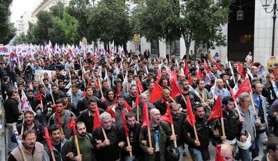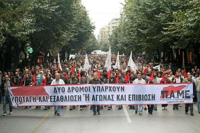 Первые стачечные митинги ПАМЕ (Всерабочего боевого фронта) состоялись во вторник утром в Афинах и десятках других городах. Они были массовыми и динамичными. Демонстрация Афин вновь заполнила весь центр города. Тысячи трудящихся, самозанятых, профессионалов и мануфактурщиков, молодёжи и женщин громогласно заявили о своем неприятии диких антинародных, антирабочих мер коалиционного правительства, ЕС и тройки. Центральный лозунг митинга - “Свергнуть меры. Слово за народом. Либо мы, либо монополии”.