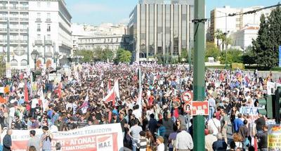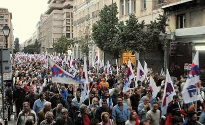 В Афинах площадь Синтагма в течение двух дней была заполнена десятками тысяч демонстрантов.После того как ПАМЕ (Всерабочий боевой фронт) окружил площадь Синтагма во вторник, в среду вечером тысячи людей изо всей Аттики отправились под знамёнами ПАМЕ с площади Омониа к центру города. Они откликнулись на призыв многих отраслевых федераций, классовых профсоюзов и профсоюзных деятелей, входящих в состав ПАМЕ, а также на призыв самозанятых мелких ремесленников и торговцев (ПАСЕВЕ), студентов МАС (Фронт борьбы студентов) и женщин из ОГЕ (Федерация женщин Греции).